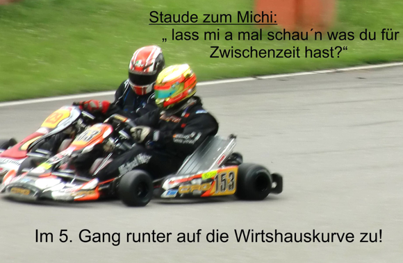 Den besten Start im ersten Rennen erwischten jedoch Adrian Emminger und Kevin Schneck. Auf Platz drei folgte Tobias Nath. Christopher Dreyspring büßte einige Plätze ein. In Runde drei wollte Kevin Schneck dann am Ende der Start-Ziel-Geraden auch die Führung übernehmen, mit etwas Geschwindigkeitsüberschuss konnte er seine Linie jedoch nicht halten und musste auf die Wiese. Dadurch verlor er zunächst den Anschluß. Einige Piloten, darunter auch Christopher zogen an ihm vorbei. Adrian Emminger behielt seine Führung. In Runde acht musste er diese aber an Dreyspring abgegeben. Somit war die Reihenfolge in Runde neun: Christopher Dreyspring, vor Adrian Emminger, Florian Siemens und Kevin Schneck, der sich schon wieder bis auf Platz vier vorgearbeitet hat. Kevin Schneck war schon kurz davor sich den dritten Platz zu sichern bevor er zweimal in der sogenannten Wirtshauskurve in den Reifenstapel einschlug. Er konnte sein Kart zwar immer wieder auf die Strecke zurückbringen doch mit verbogener Spurstange und schon etwas Rückstand war der Sieg sicher dahin. Zwei Runden vor Ende des Rennens musste der bis dato auf Platz zwei liegende Adrian Emminger aufgrund eines Ausrutschers sein Kart abstellen. Der Sieg im ersten Rennen ging somit an Christopher Dreyspring. Zweiter wurde Florian Siemens vor Kevin Schneck.